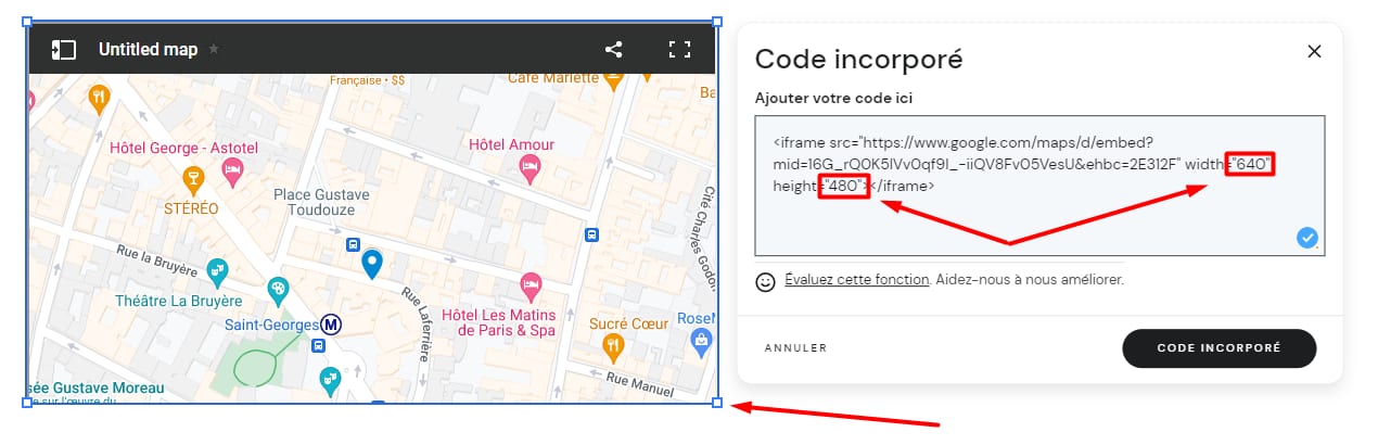 Vous obtiendrez le code de votre carte. Copiez-le, et collez-le sur votre site Web à l’aide de l’élément de code incorporé. Si vous souhaitez que la carte soit plus grande ou plus petite, redimensionnez l’élément de code ou modifiez les chiffres de largeur et de hauteur dans le code de l’élément de code incorporé :