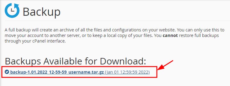 Dans la fenêtre suivante, cliquez sur Télécharger une sauvegarde complète du compte. Vous pouvez choisir dans une liste de sauvegardes précédemment générées, si elles sont disponibles, ou générer une nouvelle sauvegarde. Téléchargez la sauvegarde souhaitée en cliquant sur le lien :