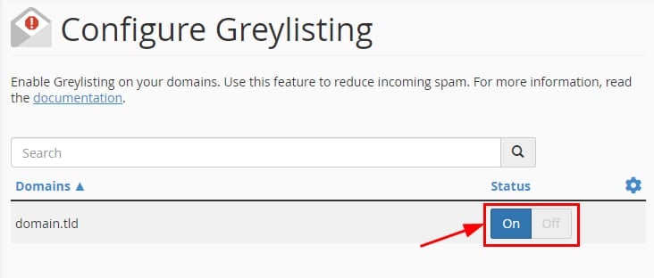 Sélectionnez le domaine pour lequel vous voulez désactiver le greylisting et changez le statut en Désactivé :