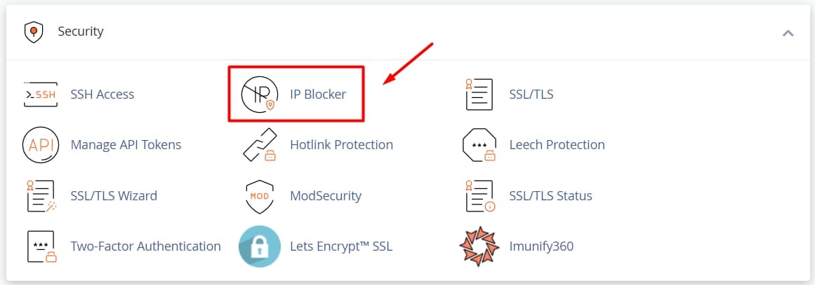 Si vous souhaitez limiter l’accès à votre site Web en bloquant une adresse IP sur cPanel, vous pouvez le faire en accédant à Security → IP Blocker :