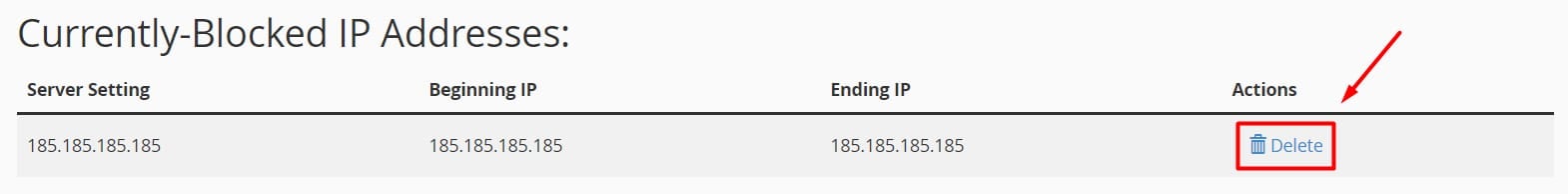 Pour réactiver l’accès, il suffit de se rendre dans la liste Adresses IP actuellement bloquées dans la même section et de cliquer sur Delete :