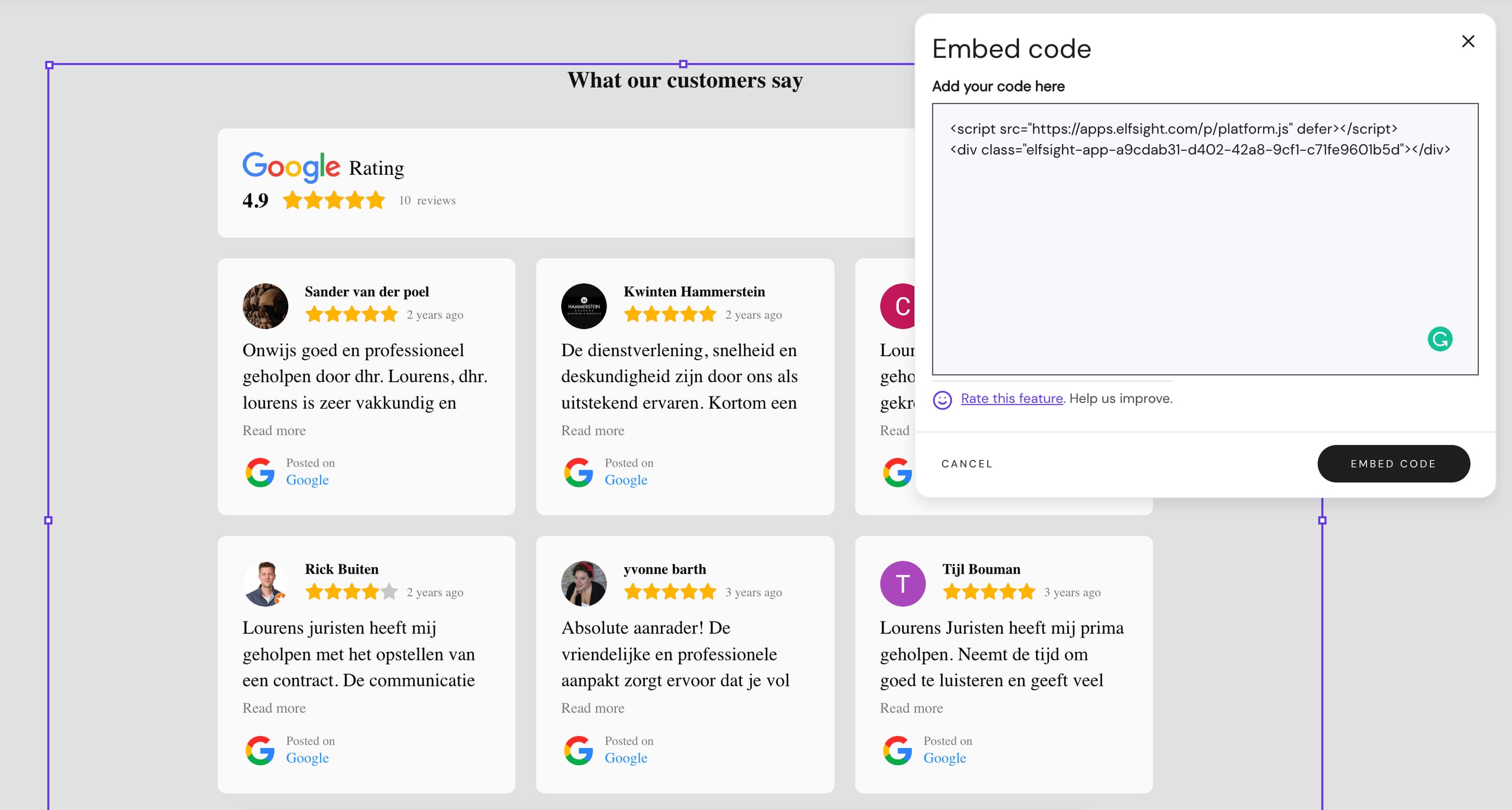 Vous pouvez facilement incorporer les avis de Trustpilot, Google ou d’autres plateformes en insérant un code personnalisé dans votre site web. Le code peut être inséré dans votre site web de deux manières (la manière exacte dépend de l’intégration que vous décidez d’utiliser) :