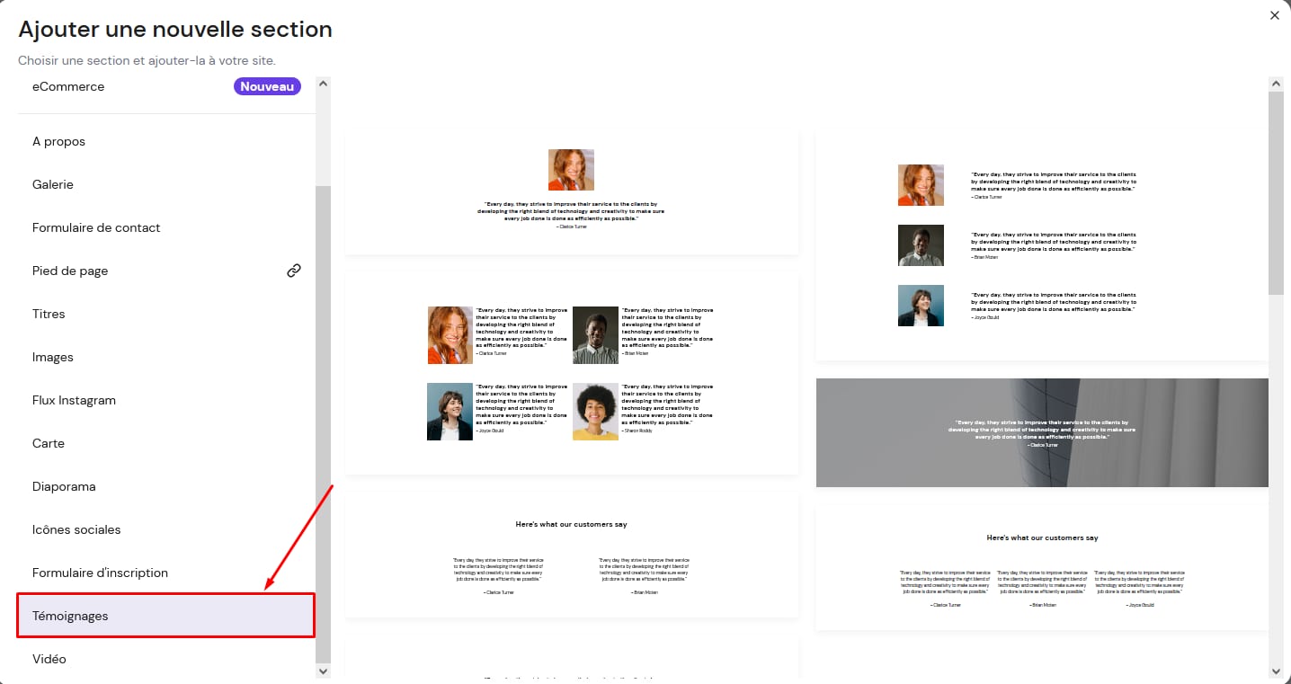Dans le menu des sections, à gauche, sélectionnez Témoignages, et à droite, sélectionnez le modèle de section souhaité. Cliquez dessus, et elle sera insérée dans votre page :