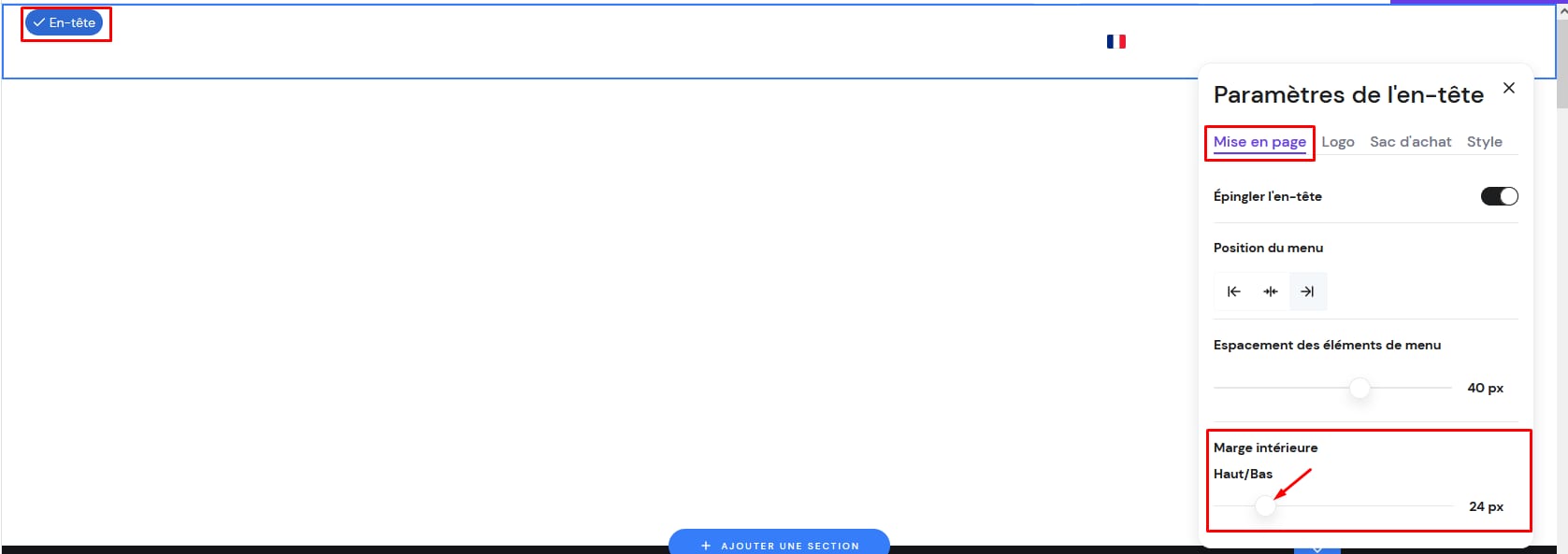 Pour redimensionner la barre de menu du site web, ouvrez les paramètres de mise en page de l’en-tête et modifiez la marge supérieure/inférieure :