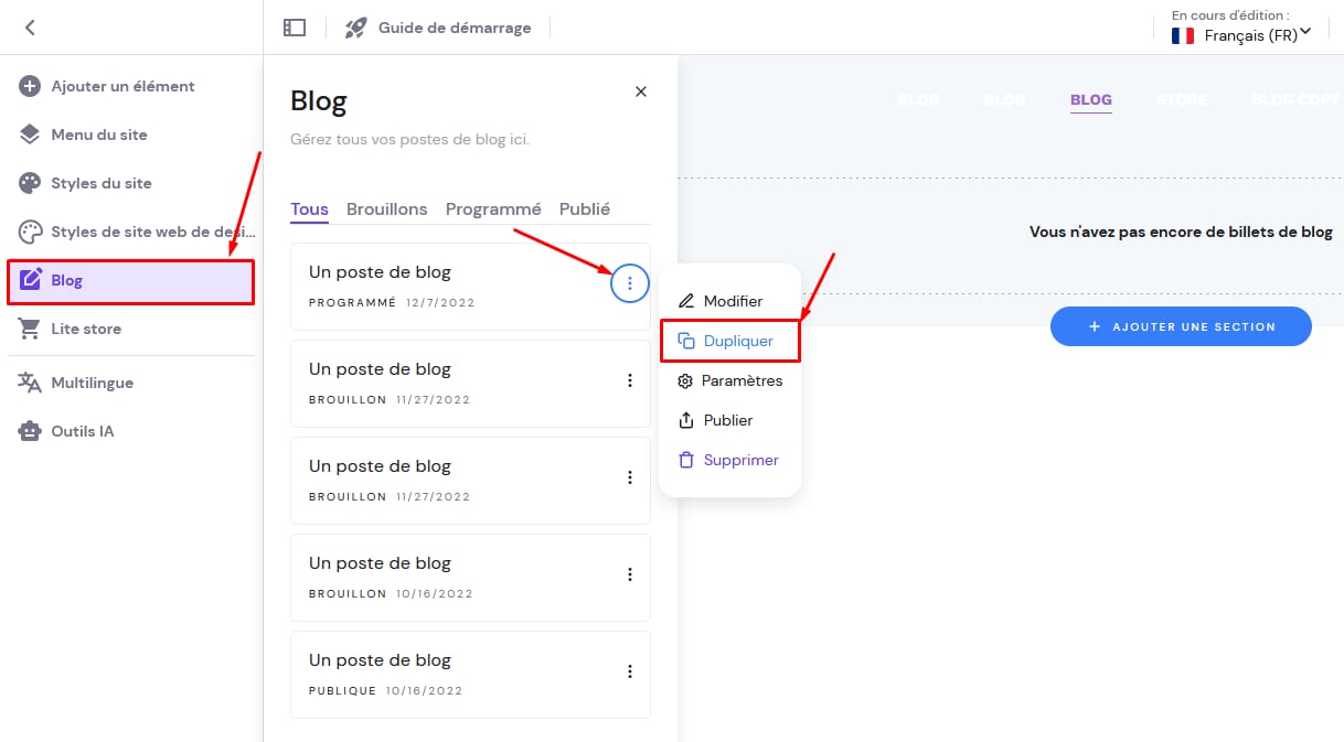 Dans l’éditeur, ouvrez le panneau de gestion du blog à gauche et trouvez un article que vous voulez dupliquer. Cliquez sur le bouton représentant une ellipse ⋮ près du titre de l’article de blog et cliquez sur Dupliquer :