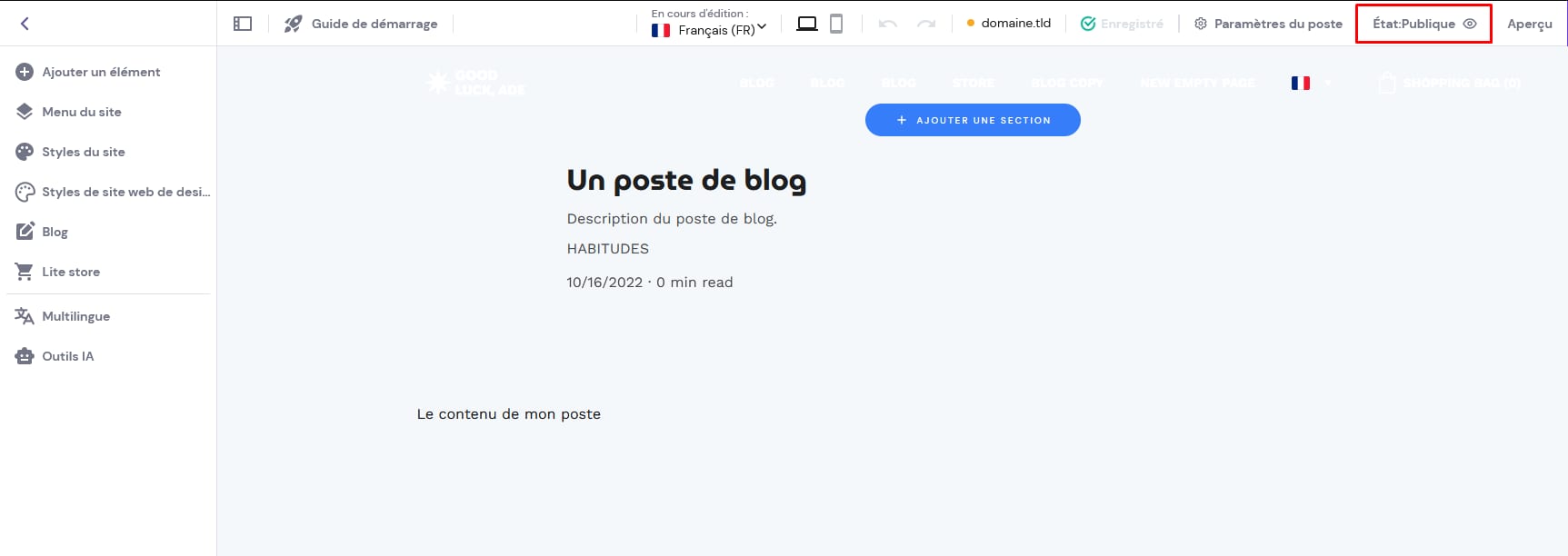 Vous pouvez également le dépublier dans l’éditeur d’articles de blog. Dans la barre d’outils supérieure, cliquez sur l’option État:Publique, et l’article deviendra un brouillon :