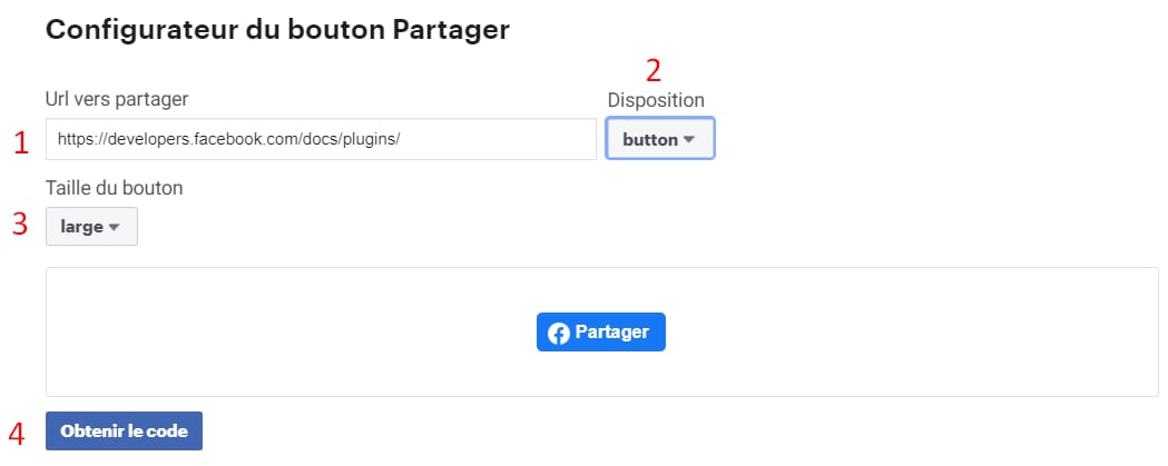 Avec l’aide du configurateur de boutons de partage de Facebook, vous pouvez facilement créer et intégrer des boutons de partage dans votre site web.