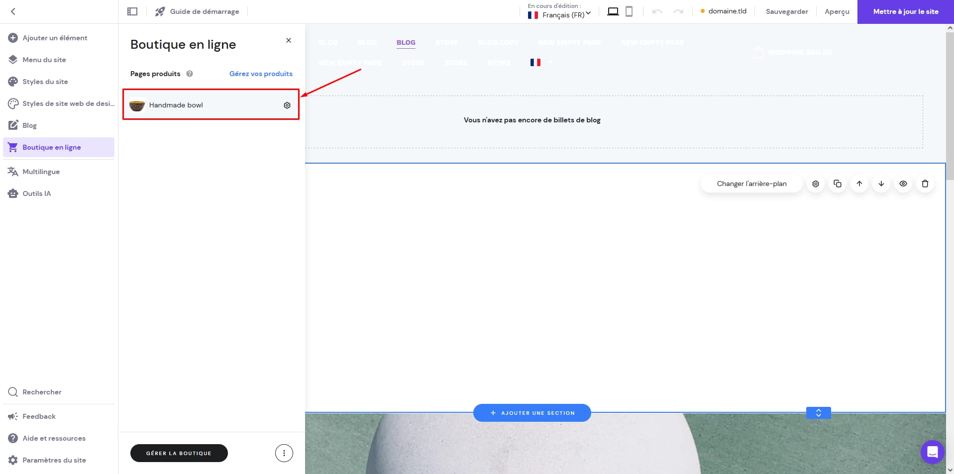 Pour trouver toutes vos pages de produits, accédez au créateur de site web et développez le panneau Boutique en ligne sur la gauche :