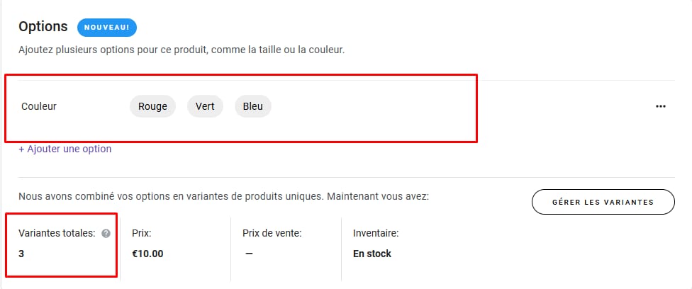 3. Cliquez sur Gérer les variantes pour spécifier le prix et la quantité en stock de chaque variante de produit :