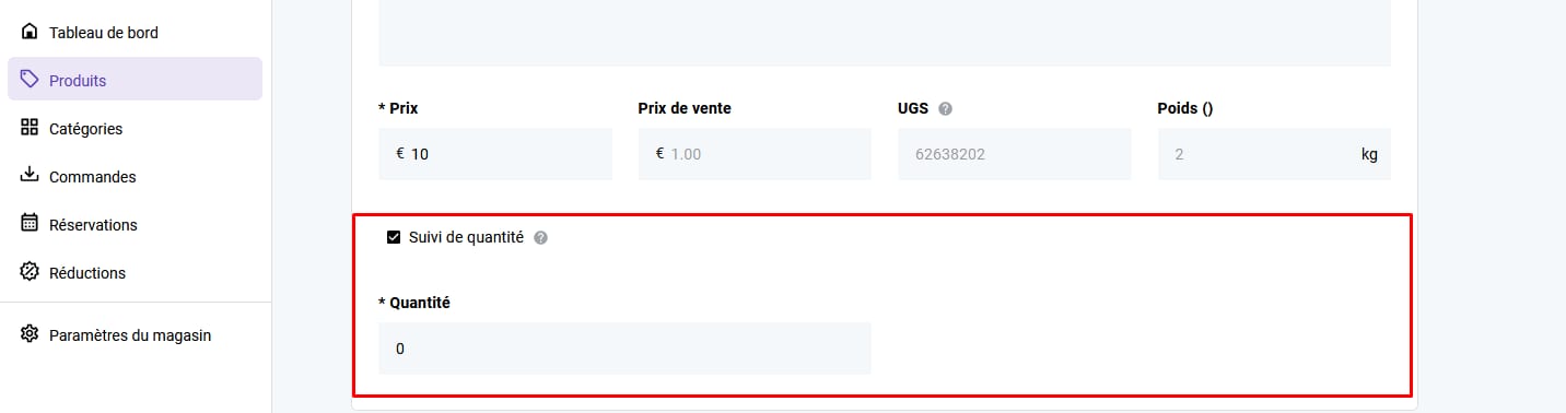 Activez l’option Suivi de quantité et spécifiez la quantité en stock :