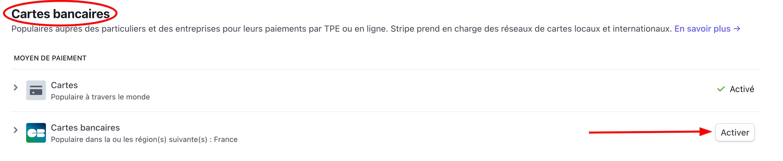 3. Faites défiler l’écran jusqu’à la section Cartes bancaires, puis cliquez sur Activer à côté de Cartes bancaires :