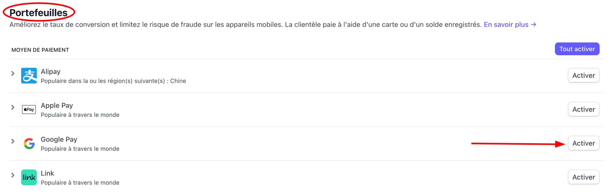 3. Faites défiler vers le bas jusqu’à la section Portefeuilles, puis cliquez sur Activer à côté de Google Pay :