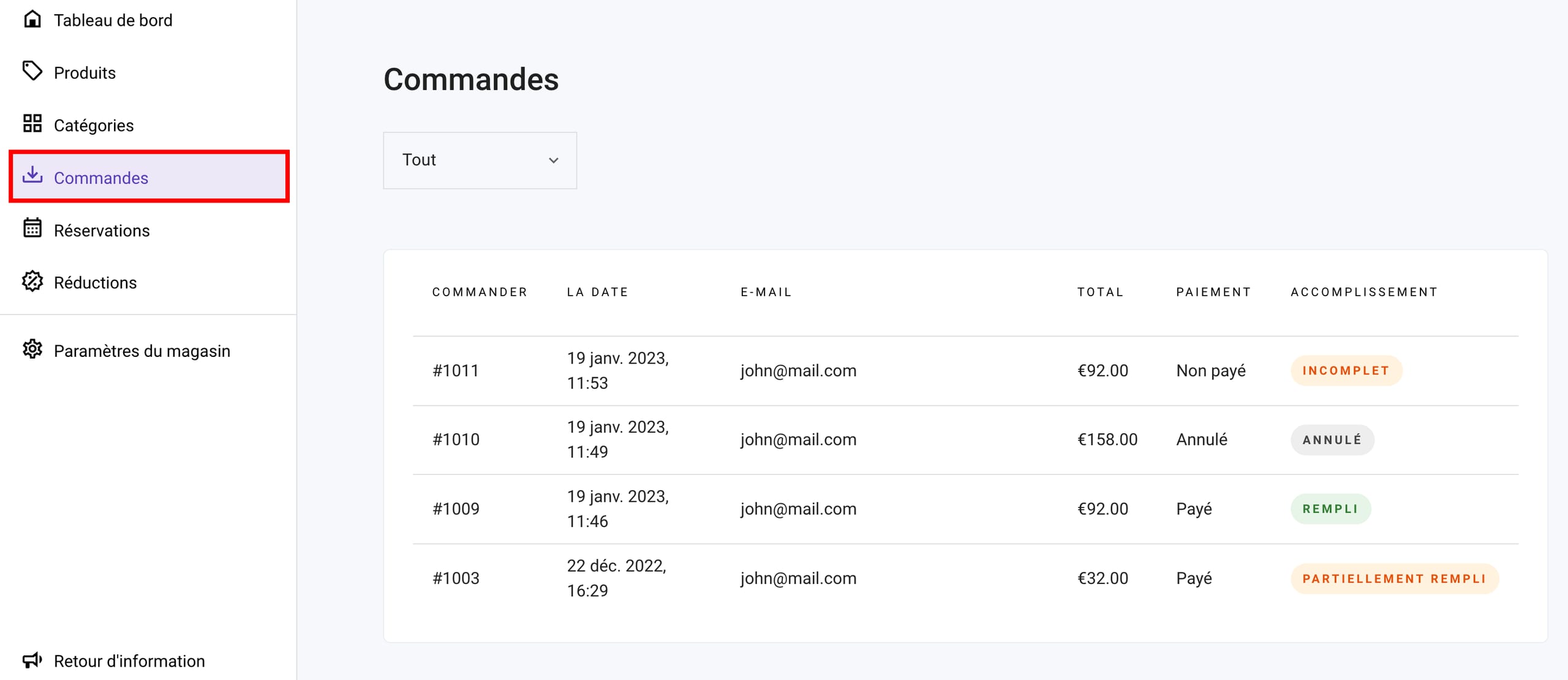 Vous pouvez retrouver toutes vos commandes dans la section Commandes de la zone de gestion de votre boutique.