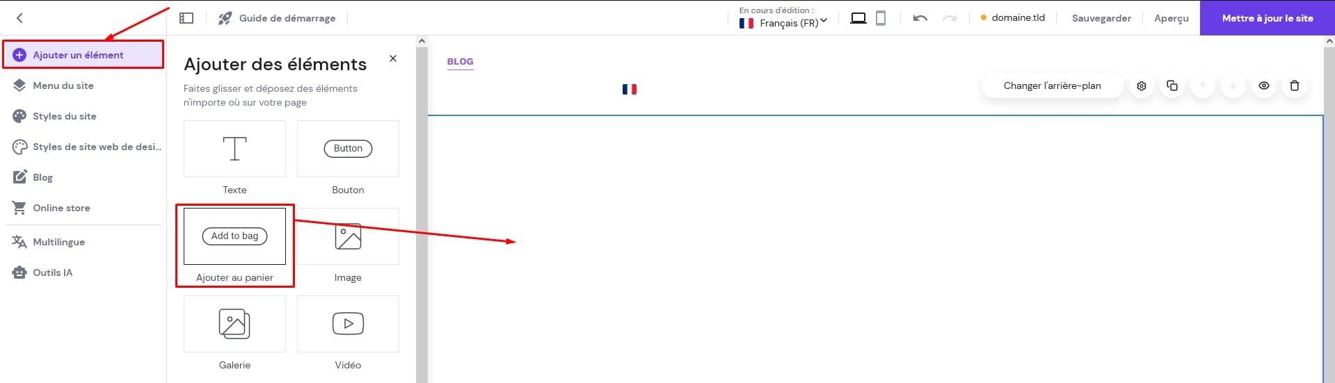 Développez le panneau Ajouter un élément sur la gauche, trouvez le bouton Ajouter au panier, puis faites-le glisser et déposez-le n’importe où sur votre page :