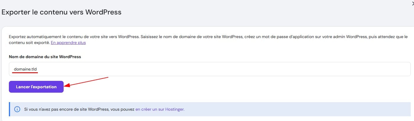 Si vous utilisez le créateur de sites internet de Hostinger et que vous souhaitez exporter le contenu de votre site vers un site WordPress, suivez les instructions ci-dessous.