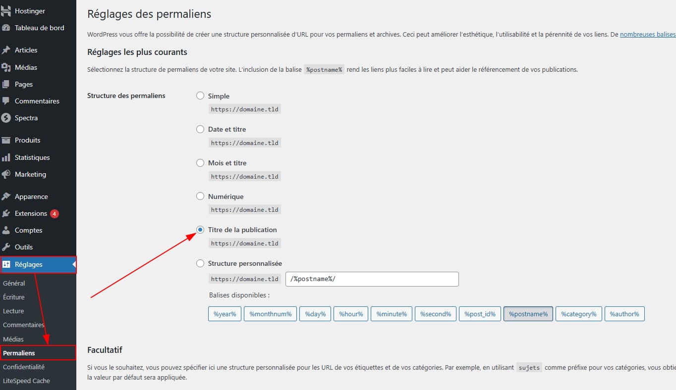 Réinitialisez la structure des permaliens de votre site WordPress en sélectionnant « Titre de la publication » comme indiqué dans l’étape 1 dans ce tutoriel :