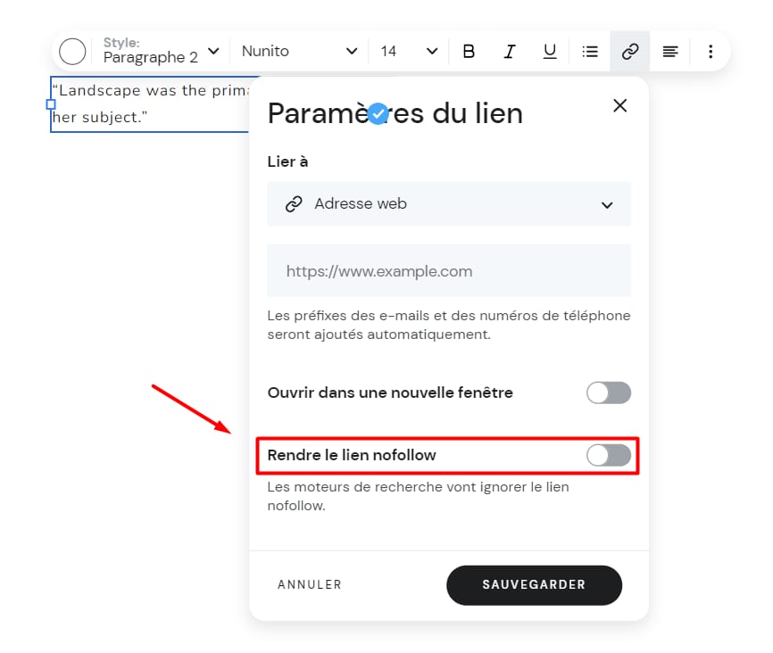 Tous les liens que vous ajoutez aux éléments de votre site Web ont l’attribut nofollow par défaut, mais vous pouvez facilement le modifier dans les paramètres du lien :