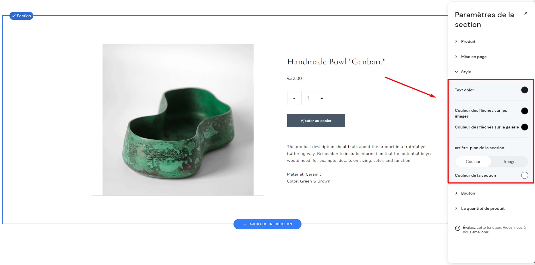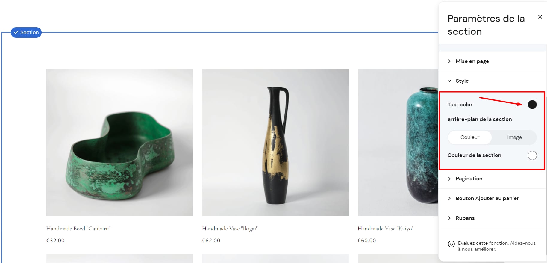Cliquez sur la section de la liste de produits, sélectionnez Modifier la section, puis modifiez la couleur dans l’onglet Style :