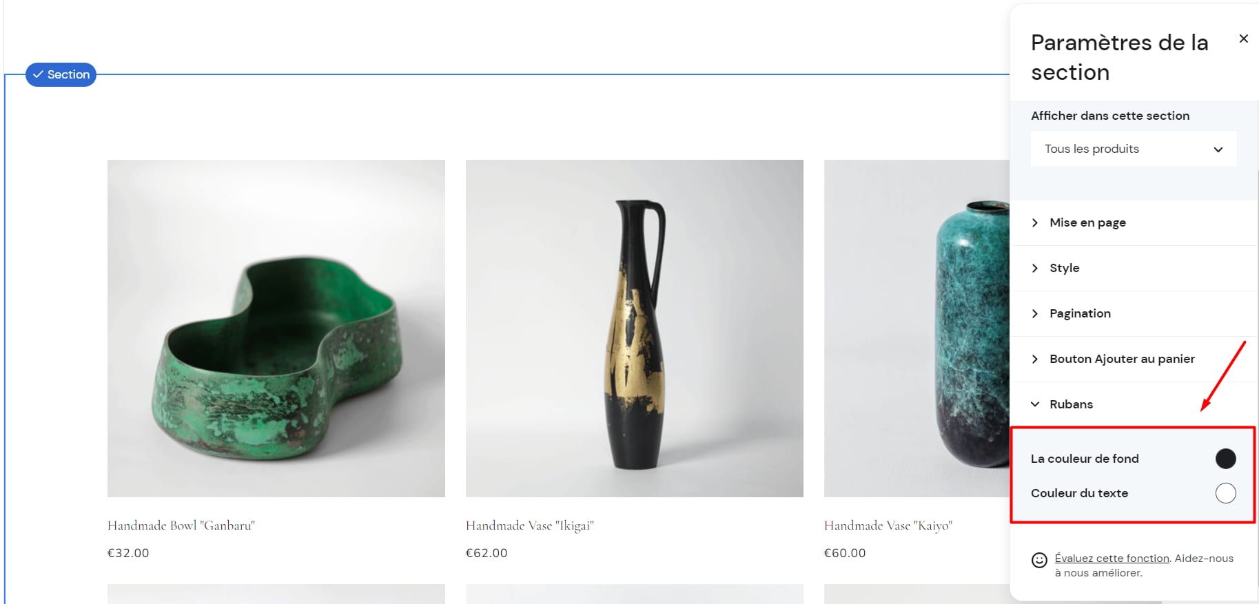 Cliquez sur la section de la liste de produits, sélectionnez Modifier la section et modifiez la couleur du ruban dans l’onglet Rubans :