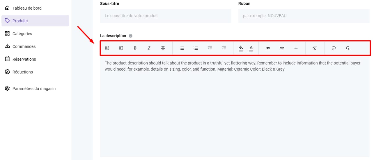 Dans la zone de gestion des produits, recherchez le champ de description et modifiez la couleur à l’aide des outils d’édition de texte :
