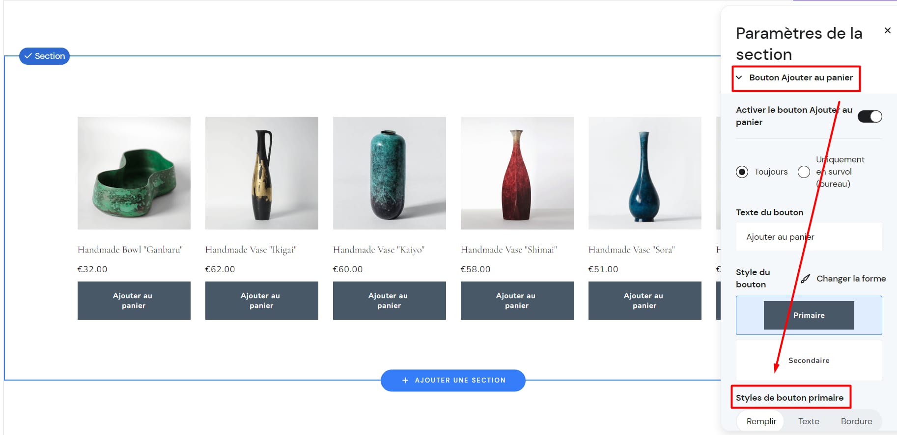 Cliquez sur la section de la liste de produits, sélectionnez Modifier la section et changez la couleur du bouton dans l’onglet Bouton Ajouter au panier :