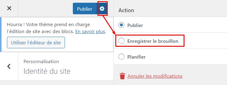 Sur la page Personnaliser, après avoir effectué les modifications, vous pouvez soit publier immédiatement, soit cliquer sur l’icône d’engrenage pour publier plus tard en choisissant Enregistrer le brouillon :
