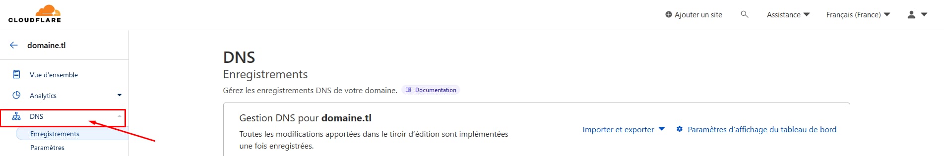 1. Dans votre compte Cloudflare, sélectionnez votre nom de domaine et ouvrez ses paramètres DNS :