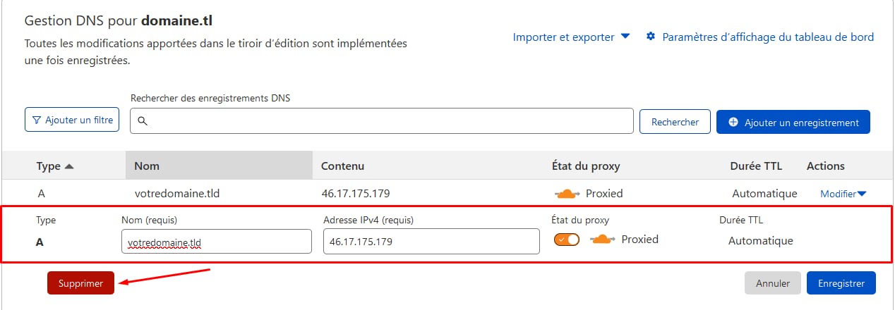 2. Supprimez les enregistrements A et/ou AAAA de votre nom de domaine racine (ceux qui font pointer votredomaine.tld vers n’importe quelle adresse IP), s’il y en a :