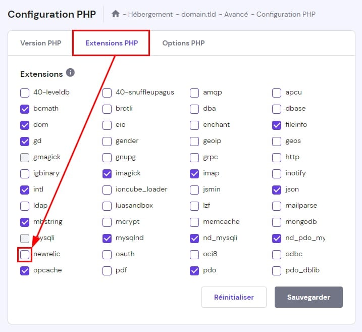 Ensuite, cliquez sur l’onglet PHP Extensions, faites défiler vers le bas pour trouver newrelic et cliquez sur la case à cocher pour l’activer :