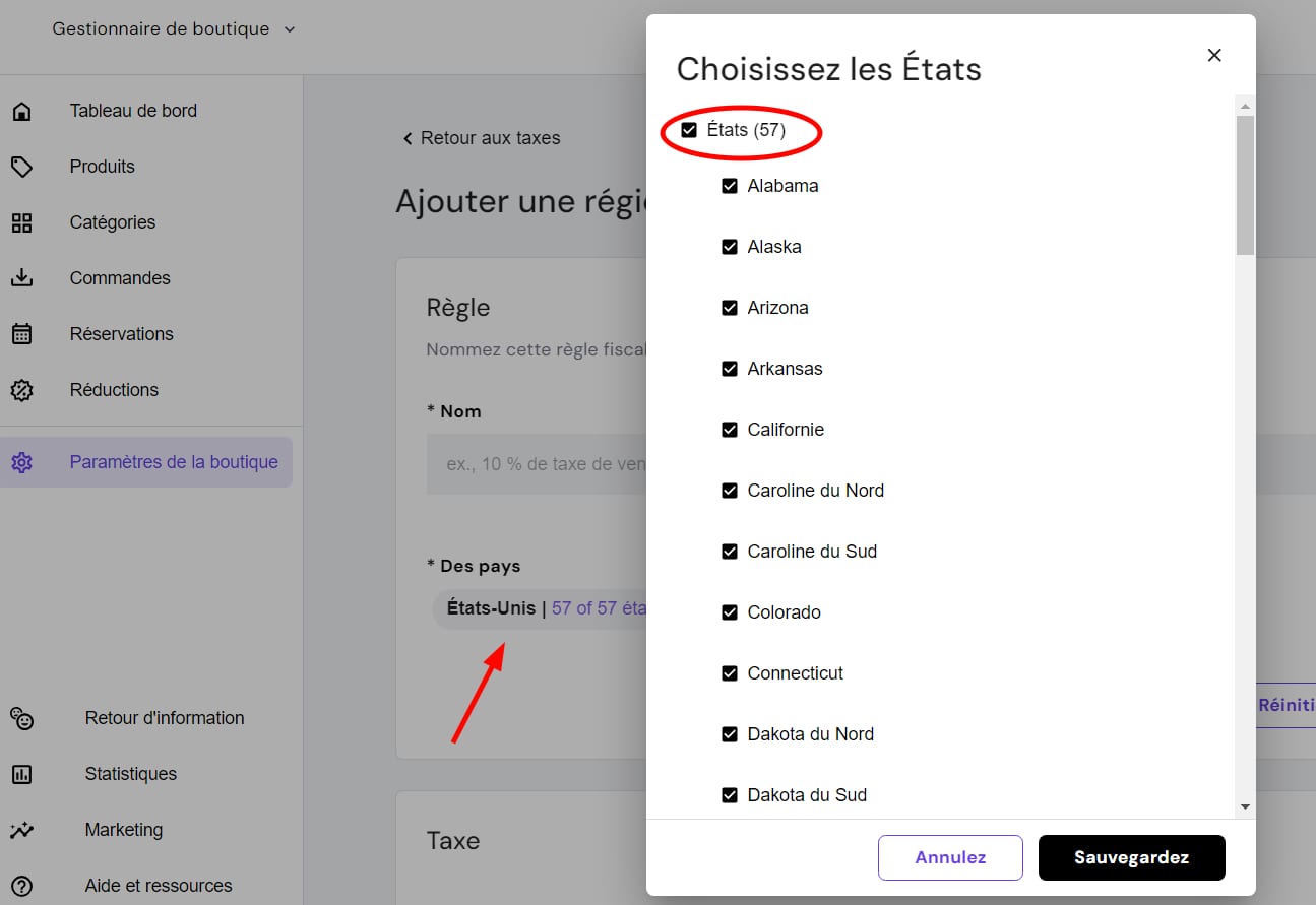 Les taxes sont affichées dans le panier, les factures et l’email de confirmation de la commande.