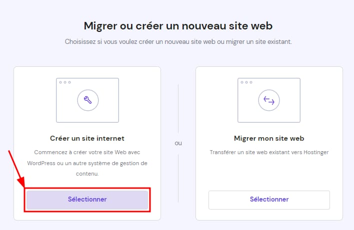 Vous serez guidé tout au long du processus de création d’un nouveau site web ou de migration d’un site existant. Pour créer un nouveau site web, sélectionnez Créer un site internet :