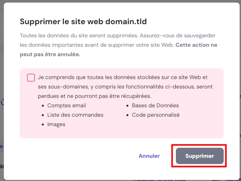 Finalement, confirmez l’action en la cochant et cliquez sur Supprimer. De cette façon, votre site web sera supprimé du plan d’hébergement.