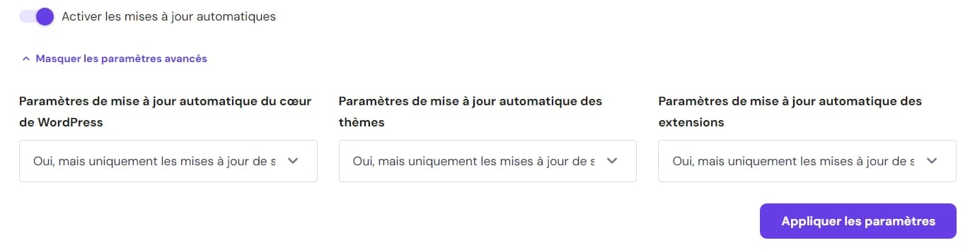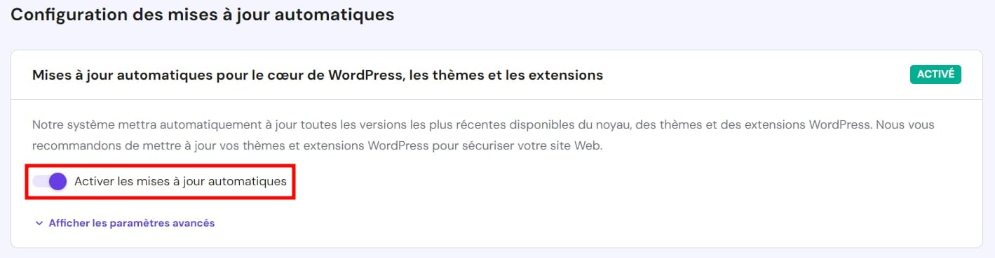 Lors de l’activation des mises à jour automatiques de WordPress dans hPanel, les mises à jour automatiques natives de WordPress sont désactivées 💡 |