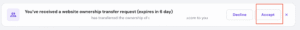 - Un email de confirmation sera envoyé au compte de destination. Le propriétaire de ce compte doit accepter la demande de transfert en cliquant sur le lien dans l’email de confirmation. Il est également possible d’accepter le transfert de propriété via hPanel. Notez que la demande n’est valable que pendant 7 jours.