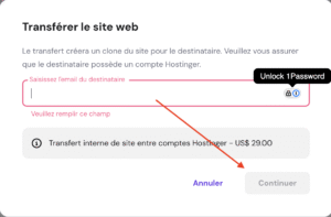 - Cette procédure ne s’applique pas aux sites web créés avec le créateur de sites internet de Hostinger. Le transfert de ces sites entre comptes Hostinger n’est pas encore disponible.