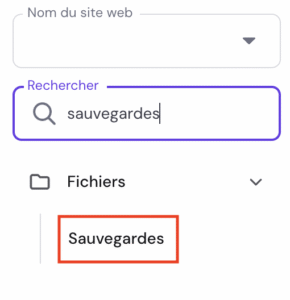 - Rendez-vous dans hPanel, sous « Sites web » et cliquez sur « Tableau de bord » à côté du site concerné. Ensuite, saisissez « Sauvegardes » dans la barre de recherche à gauche de l’écran. Cliquez sur « Sauvegardes ».