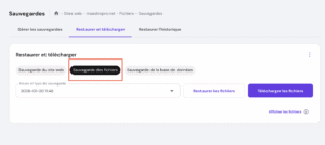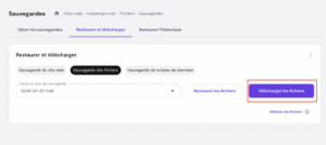 - La liste complète de toutes les sauvegardes disponibles par date s’affiche dans un menu déroulant. L’heure indiquée correspond au moment de la création de la sauvegarde, dans votre fuseau horaire local. Choisissez la date de sauvegarde souhaitée parmi les options puis cliquez sur « Télécharger les fichiers ».