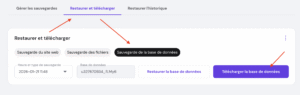 La procédure est plus ou moins la même pour télécharger des bases de données générées : sélectionnez « Sauvegarde de la base de données ». Choisissez la base de données de votre site ainsi que la date de sauvegarde, puis cliquez sur « Télécharger la base de données ».