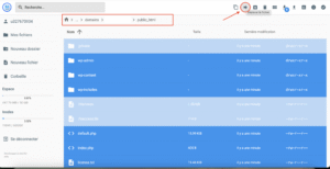 - Pour cela : ouvrez le dossier contenant les fichiers extraits (dans notre exemple, le dossier sauvegarde) → domains → sélectionnez le nom de domaine concerné → ouvrez son dossier public_html. Sélectionnez tous les fichiers puis cliquez sur « Déplacer le fichier » en haut à droite.