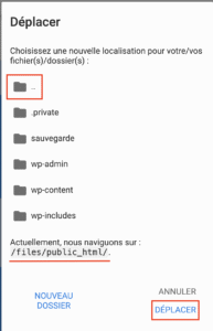 - Double-cliquez sur .. pour revenir au répertoire parent jusqu’à /public_html, puis cliquez sur « Déplacer ».