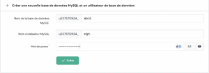 - Dans la section « Créer une nouvelle base de données MySQL et un utilisateur de base de données », saisissez le nom, le nom d’utilisateur et le mot de passe de la base de données.