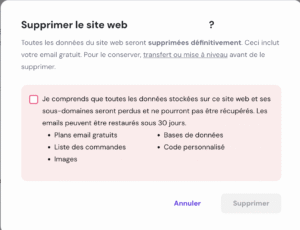 Enfin, confirmez l’action en cochant la case de confirmation puis en cliquant sur « Supprimer ». Votre site web sera ainsi retiré du pack d’hébergement.