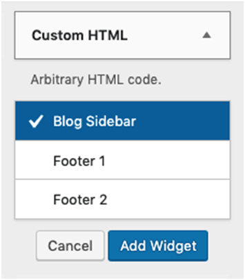 Pour modifier le HTML (Editeur Html), vous devez d’abord choisir le widget ciblé, apporter des modifications et l’enregistrer. D’autre part, vous pouvez ajouter de nouveaux widgets à partir du menu HTML personnalisé. En fonction du thème que vous avez activé, les options peuvent varier. Par exemple, en utilisant le thème Twenty Seventeen, vous disposez des options suivantes : Barre latérale du blog, Pied de page 1 et Pied de page 2. Une fois que vous avez ajouté les détails, enregistrez-les.