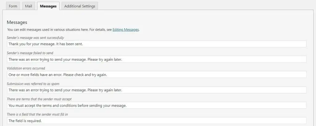 Enfin, si vous souhaitez modifier la réponse automatique, rendez-vous dans l’onglet Messages. Contact Form 7 vous permet de modifier la note de remerciement, les messages d’erreur et de nombreuses autres réponses.