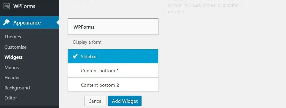Sur la barre latérale – Allez dans Apparence -> Widgets. Localisez et cliquez sur le widget WPforms. Après cela, choisissez Sidebar.