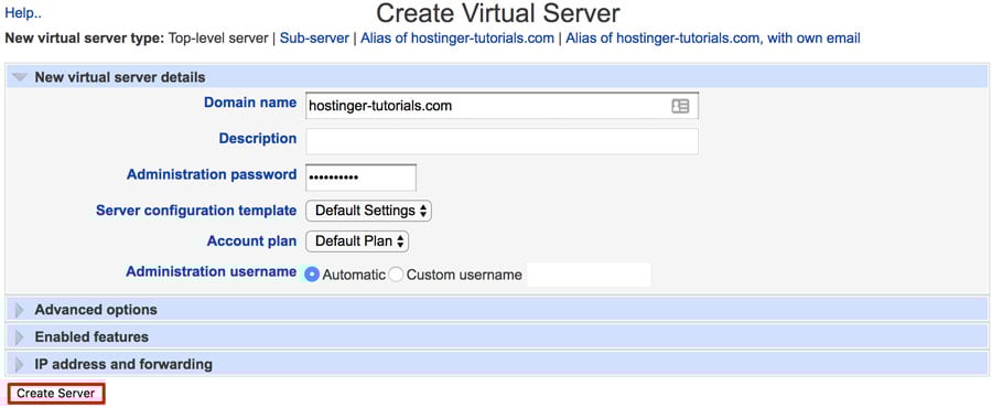 Entrez le nom de domaine et le mot de passe d’administration et appuyez sur le bouton Créer un serveur. Cela créera un serveur simple qui est suffisant pour héberger un site web.