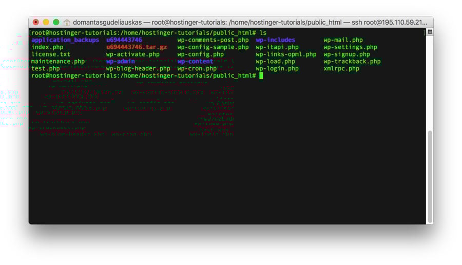 Une fois connecté, modifiez votre répertoire dans le répertoire de travail, où les fichiers de votre site web seront stockés. Virtualmin crée automatiquement un répertoire en fonction du nom de domaine. Par exemple, pour le domaine hostinger-tutorials.com, il a créé le répertoire nommé hostinger-tutorials.com. Ainsi, pour y accéder, nous pouvons utiliser cette commande :