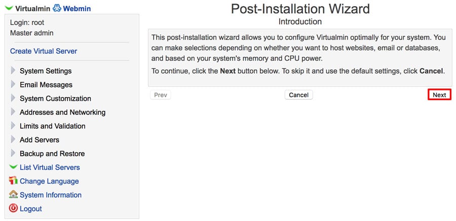 Vous verrez maintenant un assistant de post-installation Webmin qui vous guidera dans l’installation étape par étape du serveur. Cliquez sur le bouton suivant pour commencer la configuration.