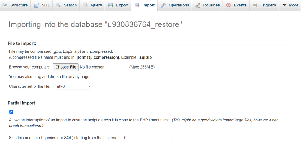 Le fichier de sauvegarde de votre base de données doit avoir une taille inférieure à 256 Mo. C’est la taille maximale pour les téléchargements de fichiers dans phpMyAdmin.