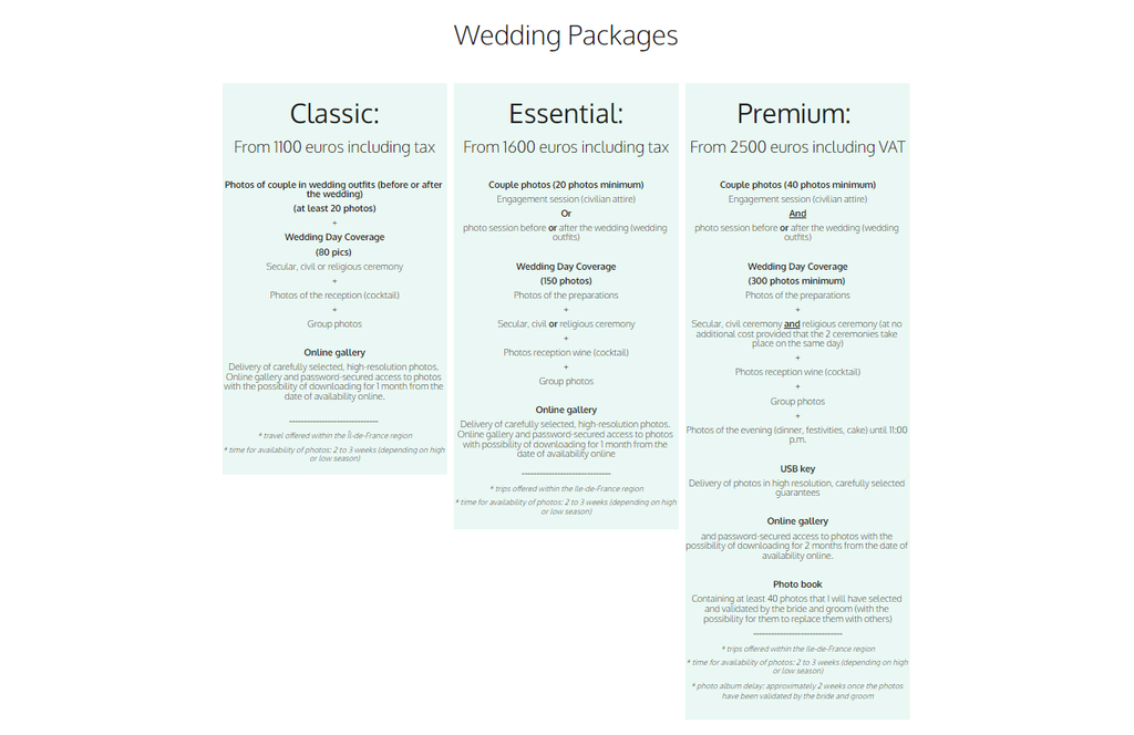 Les autres photographes de mariage peuvent s’inspirer de la façon dont Wallois organise ses services. Les offres sont placées côte à côte, ce qui permet aux visiteurs de les comparer facilement et de choisir la meilleure.